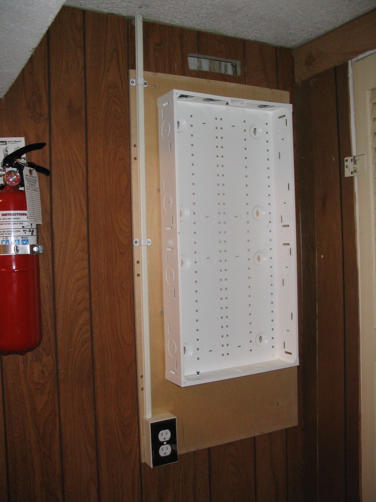 Here is the main panel where all the connections will originate from. I had to add the outlet (mounted to board on left side) since there are no drops nearby.
