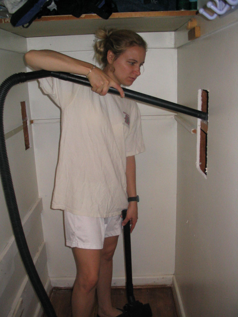 Kristin cleaning up the holes in the closet where the Living Room & Blue Room drops went through the fire stops.