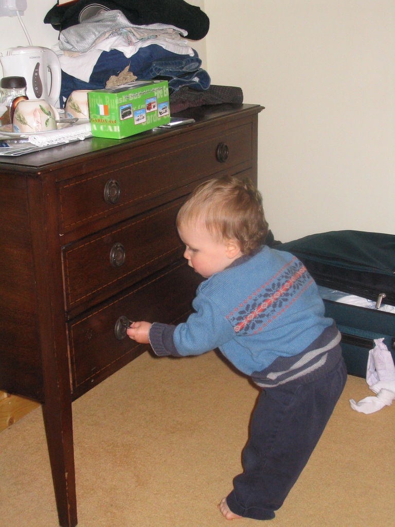 Kyle opening drawers in our room at Atlantic Cottage.