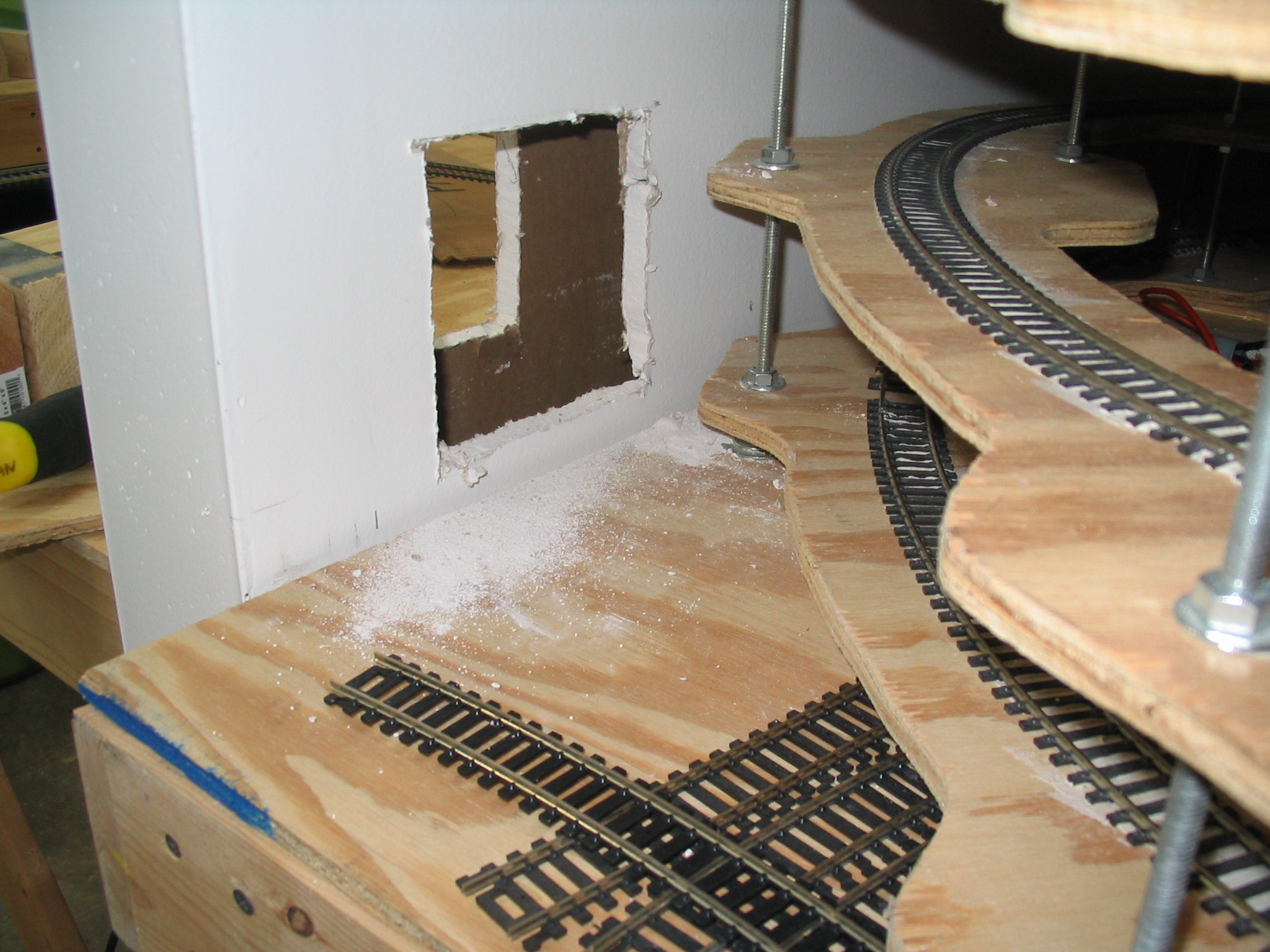 The new access hole for the helix, lower level, into the layout room.
